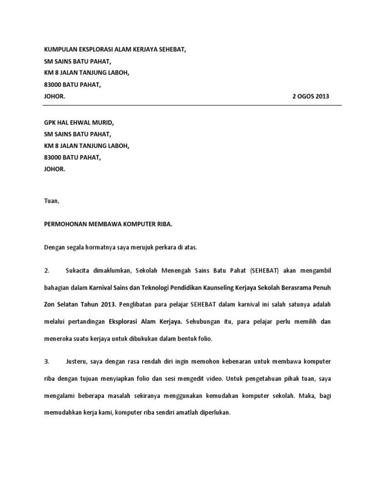 Surat Rasmi Memohon Kebenaran Menggunakan Peralatan Sukan Pdf